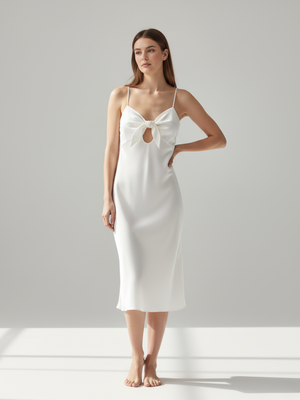 100% Mulberry Silk Evening Gown – Elegant Bow Design, Soft & Luxurious Formal Dress