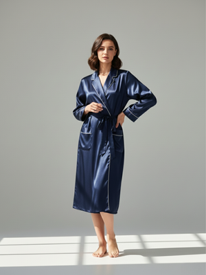 100% Mulberry Silk Long Robe for Women – Luxury Sleepwear & Elegant Loungewear with Contrast Trim