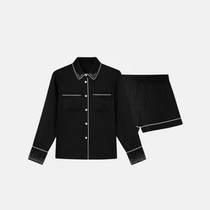 Indulge in effortless elegance with this 100% mulberry silk pajama set, crafted to elevate your moments of rest and relaxation. Made from premium mulberry silk, it features a long-sleeve button-down shirt with delicate piping and matching shorts, creating a chic yet comfortable silhouette. Whether for lounging or sleeping, this set blends timeless sophistication with ultimate comfort.
