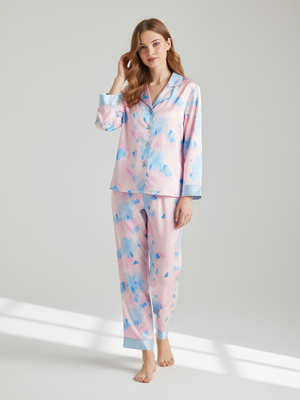 Indulge in elegance and comfort with this luxurious pajama set crafted from pure Mulberry silk. The soft, glossy texture feels gentle against the skin, offering a breathable and soothing sleep experience. Featuring a graceful watercolor print and a relaxed fit, this long-sleeve top and matching pants set brings sophistication to your nightly routine.